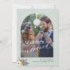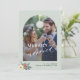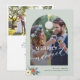 Modern typografi manus glatt gifta foto salvia grön bröllopsannons högtidskort med valv foto, anpassad text och en liten jul säsongsbetonad akvarell botanisk blomsterbukett.