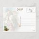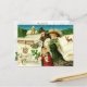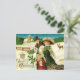 Vintage-vykort som visar en viktoriansk familj (far, mor och deras lilla flicka) som alla sitter i sitt fineri och bär inslagna presenter, sprit av holly och gräs gren med gräs-koner. Frun är klädd i en lyxig grönt päls jackar och en fjäderhatt. De snubblar i snö, och i bakgrunden kan man se en renare, ett betesstaket och möjligen en kyrka. HTM BILDER