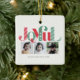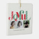 Dessa 2,75-tums x 2,75-tums fyrkantiga dekorationer har platshållare för tre (3) av dina favoritfoton, namn och år. Det icke-redigerbara hälsning är "Glatt" i ett stort dekorativt brev av rött och grönt.