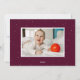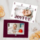 Ett lysande julkort med vågräts foto omgivet av lila gräs träd med en vit bakgrund. "Glatt" visas i fet merlot-lila-skrift med anpassningsbar hälsning och namn i familjen som visas nedan. Det glatta julkortet återgår till visningen med ytterligare ett foto och en kompakt bakgrund med nypa punkter.