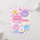 Rolig pastellfärgad glad ansikte inbjudan! Ett roligt retro trendigt tema, med rosa nyanser, pastellblå, lila, gul, blommor, blixt, stjärnor och rutigt mönster.