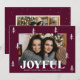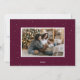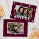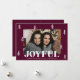 Ett lysande julkort med vågräts foto omgivet av vitt handritat gräs träd med lila bakgrund för merlot. "Glatt" visas i fet vit text med anpassningsbarna hälsning och familjen namn som visas nedan. Det glatta julkortet återgår till visningen med ytterligare ett foto och en mörk lila bakgrund med subtila vita prickar.