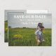 Glatt vykort för anmälan om Spara i Bröllop är ett lysande fält om blommor i lycklig. Ändra den här bilden för ett foto av dig. Den här designen kan vara personlig. Mallen har konfigurerats så att du kan göra ändringar.