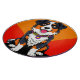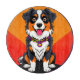Laddande illustration av en glad hund ansikte centrerad mot en djärv orange cirkel, som visar på ett dynamiskt färg och en roligt, tecknad stil.