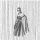 Detta är en snyggt svartvit illustration av mode, där en kvinna i en dramatisk, vid sidan av skuldra med intrikata blommigtar och ett flytande, rent skal. Bakgrunden har en slående lodrät linje struktur, som lägger till djup och rörelse