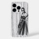 Detta är en snyggt svartvit illustration av mode, där en kvinna i en dramatisk, vid sidan av skuldra med intrikata blommigtar och ett flytande, rent skal. Bakgrunden har en slående lodrät linje struktur, som lägger till djup och rörelse
