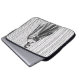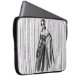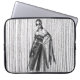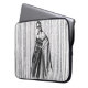 Detta är en snyggt svartvit illustration av mode, där en kvinna i en dramatisk, vid sidan av skuldra med intrikata blommigtar och ett flytande, rent skal. Bakgrunden har en slående lodrät linje struktur, som lägger till djup och rörelse