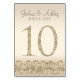 Den här moderna bord-kortsdesignen innehåller faux-accenter från guld glitter med champagnebakgrund. Perfekt för elegant och modernt bröllop. Bordsnumret går upp till 30.