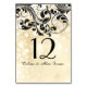 Ett bord-kort i elegant- och klassformat med en svart blomning av glitterkurvor på en färgad av faux metallisk champagne med båda baksidorna. Klicka på knappen ANPASSA IT för att lägga till text och bordsnummer. Kommer i 5 färg. Matchande inbjudningar, RSVP, cocktail-blöjor och annat tillgängligt. För frågor eller förfrågningar om andra objekt som har denna design, kontakta: cheryl@cheryldanielsart.com. "Black Glitter Curlicue Swoboda" av Cheryl Daniels © 2015.
