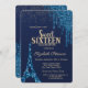 En modern, chic och glamorös 16 med blå glitter-droppar, Eiffel Torn.