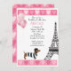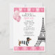 Den här chicen Pariskonstruktionen har Eiffel torn med en-ballonger och glitter rosa-ballonger med glitter rosa hjärt-gräns. Anpassa enkelt den här födelsedagsinbjudan med din party-information i snyggt svart och rosa.