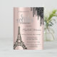 Ett modernt, chic och glamoröst sött 16 med svarta droppar från glitter och svart Eiffel torn mot bakgrund av ro guld.