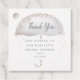 En snygg, feminin bröllopsfest tack-märkning med rosa guldglitterkonfetti som faller på en mjuk grå akvarellparaply med kalligrafiskart tack-meddelande högst upp och redigerbart tack-meddelande och evenemangsdatum nedan.