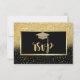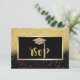 Guldt glittrande examenshatt och konfetti på svart bakgrund.