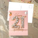 Träd in i rampljuset för firandet med detta strålande postkort för 21-årsdagen - en sann mästarklass skapad specifikt för dessa oförglömliga milstolpar. Designen dansar med elegans: en hypnotiserande "21" prydd med skimrande pärlor och gyllene accenter, mot en mjuk rosa bakgrund där graciösa vita och gyllene ballonger svävar som drömmar som tar flyg. Varje detalj är en hyllning till livet och inbjuder dig att ge det en personlig touch genom att helt anpassa texten för att uttrycka dina egna hjärtliga önskningar.