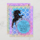 En svart silhuett enhörning med färgglada stjärnor överallt på en teal-färgad quatrefoil-bakgrund med rosa och guld glittrande kant och sedan en tealblå cirkel med en ädelstensdekoration där du kan anpassa din händelse. Whimsical festliga flickiga vibbar.