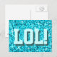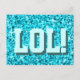 Vykort med en modern design med stjärnor som är spridda över en stiliserad "sekvin look"-bakgrund i mönster och "LOL!" i blå nyanser. Kan användas som bakgrund för din egen text, bilder och dina idéer. Observera att det här är en tryckt digitalbild som inte skiner eller innehåller äkta glitter eller sekvenser.