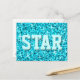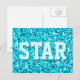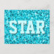 Vykort med en modern design med stjärnor som är spridda över en stiliserad "sekvin look"-bakgrund i mönster och "STAR" i blå nyanser. Kan användas som bakgrund för din egen text, bilder och dina idéer. Observera att det här är en tryckt digitalbild som inte skiner eller innehåller äkta glitter eller sekvenser.