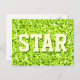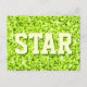 Vykort med en modern design med stjärnor som är spridda över en stiliserad "sekvin look"-bakgrund i mönster och "STAR" i skalor av kalkgrönt. Kan användas som bakgrund för din egen text, bilder och dina idéer. Observera att det här är en tryckt digitalbild som inte skiner eller innehåller äkta glitter eller sekvenser.
