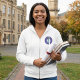 Layer up with ease in this cozy women's full-zip hoodie featuring the International Graduate design. The zippered front makes it versatile for changing weather. It showcases the globe graphic with a mortarboard, symbolizing worldwide knowledge and academic success. Perfect for female university students, alumni, or teachers needing an extra layer on campus.