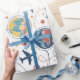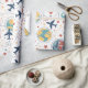 Vibrant seamless pattern wrapping paper featuring airplanes, globes, flight paths, stars, and travel-inspired icons in a playful aviation style. Ideal for travelers, aviation enthusiasts, frequent flyers, and anyone who loves global adventure aesthetics.