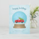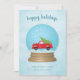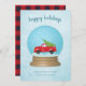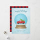 Gamla röda lastbil med julgran-Helgdagskort som inte är fotoceller och som visar snö-jordgloben, ljusblå texturerad bakgrund, medan baksidan har en röd buffel som plaid mönster. Anpassa enkelt din egen text idag.