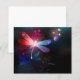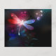 Flygande, röd drakflygning, med genomskinlig, detaljerad vingar på mörk, nattlig, ljusstrålande bakgrund med tropiska växter och eldflugor. Red Dronfly.