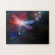 Flygande, röd drakflygning, med genomskinlig, detaljerad vingar på mörk, nattlig, ljusstrålande bakgrund med tropiska växter och eldflugor. Red Dronfly.