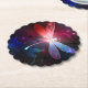 Flygande, röd drakflygning, med genomskinlig, detaljerad vingar på mörk, nattlig, ljusstrålande bakgrund med tropiska växter och eldflugor. Red Dronfly.