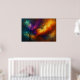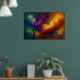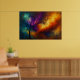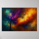 Ett ensamt träd står silhuetterat mot en himmel i brand med rörelse och känsla. Till vänster virvlar djupblått och lila bakom kala grenar - stilla, inåtvända, nästan frysta i tiden. Till höger fattar himlen eld i eldröda, röda och gyllene färger, när en flock fåglar bryter ut ur färgstormen, ledda av en ensam, svävande gestalt. Kompositionen fångar ett ögonblick av förvandling: från stillhet till flykt, skymning till gryning, skugga till strålglans. Varje penseldrag pulserar av energi och inbjuder betraktaren att bevittna spänningen mellan rotfasthet och frigörelse.
