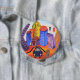 En färgstark, roligt, fantasifull målning som skildrar någon i en bil som lämnar en stad med böjt byggnad.