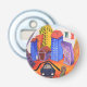 En färgstark, roligt, fantasifull målning som skildrar någon i en bil som lämnar en stad med böjt byggnad.