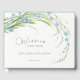 Bröllop Guest Bok med en elegant bukett av mjuka blå glöm-mig-blommor med ljust grönt löv och kurvformade stjälkar, vår eller sommarens naturliga pastel färg, en romantisk ljusbukett av vilda blommor. Botanisk digital vattenfärg. Cute-blomman botany Bröllop Guest Bok. Glöm mig-Inte samling.