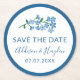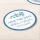 Blommigten sparar papprare underlägg i blått och vitt och glömmer mig inte att vrida. Utformningen är ramad av ett runt, djupt blått gräns. Lägg till namn i ett charmerande tunt skript ovanför ditt bröllop-datum i moderna brev.