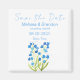 Glöm mig inte, vattenfärgsblå blommigt vår bröllop spara datum magneter. Blå botaniska blommor. Unik, handmålad teckning av konstnären Monika Howarth. Du kan anpassa den med dina detaljer.