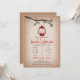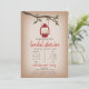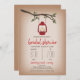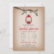 En glampinbjudan i bröllop-möhippa med en illustration av en lanterna fylld med en röd campinglampa hängande från en gren i träd med grönt löv. Bakgrunden är kardstock inspirerad. Anpassa texten med information om tillfälle.