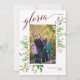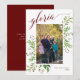 Ett vackert religiöst julkort, med ditt favoritporträttfoto i en ram av gröna akvarell-eukalyptusblad och bär, och "gloria" i vinröd/mörkröd modern kalligrafi-stil. Anpassa ytterligare med ditt familjenamn och år. Baksidan är i enfärgad vinröd/mörkröd, med bibelversen ”Ära åt Gud i höjden och frid på jorden och människorna en god vilja!” Lukas 2:14, som kan redigeras,#.