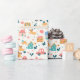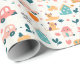 Pappra med en lekfull mönster av djur och föremål från tecknad-stil, såsom hus, bilar och hundar, alla arrangerade på ett abstrakt, på en ljusstark bakgrund som är lämplig för spädbarn och barns inslagning pappert. Utformningen är enkel men söt, med ljusa färger som passar barn, i pastel färg, med ett meddelande: "Var glatt varje dag"