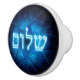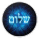 Blå och vit hebreisk text som läser, "Shalom" (ש ל ם - fred) som läggs ovanpå en elegant, blå, etsad, fasad bild av David Star.