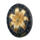Golden lily flower in full bloom, luminous metallic gold petals with soft gradient highlights. Delicate natural detailing, dark moody background for dramatic contrast.