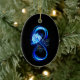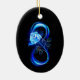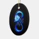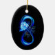 Luminous infinity symbol with glowing, beautiful, lushly blooming rose made of blue flames on black background.