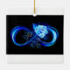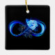 Luminous infinity symbol with glowing, beautiful, lushly blooming rose made of blue flames on black background.