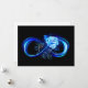 Luminous infinity symbol with glowing, beautiful, lushly blooming rose made of blue flames on black background.