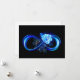 Luminous infinity symbol with glowing, beautiful, lushly blooming rose made of blue flames on black background.