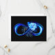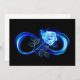 Luminous infinity symbol with glowing, beautiful, lushly blooming rose made of blue flames on black background.