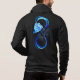 Luminous infinity symbol with glowing, beautiful, lushly blooming rose made of blue flames on black background.