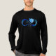 Luminous infinity symbol with glowing, beautiful, lushly blooming rose made of blue flames on black background.