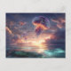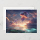 Floating surreal jellyfish illuminate the sky with their soft glow as the sun sets over a tranquil ocean. The reflective water enhances the ethereal atmosphere.