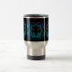 Den här resenären mugg har tre fläckiga ansikte med guldglödande ögon omgiven av ett ornat kvadratgeometriskt mönster i blå nyanser med grönt och rosa. De ställs in på en svart bakgrund för en dramatisk effekt.