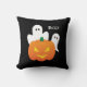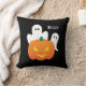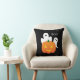 Ett dekorativ kudde för din Halloween-dekoration som fångar säsongens innersta väsen med en beundransvärd, upplyst pumpa omgiven av lekfull spöken, alla med glädje utrotar, Boo!